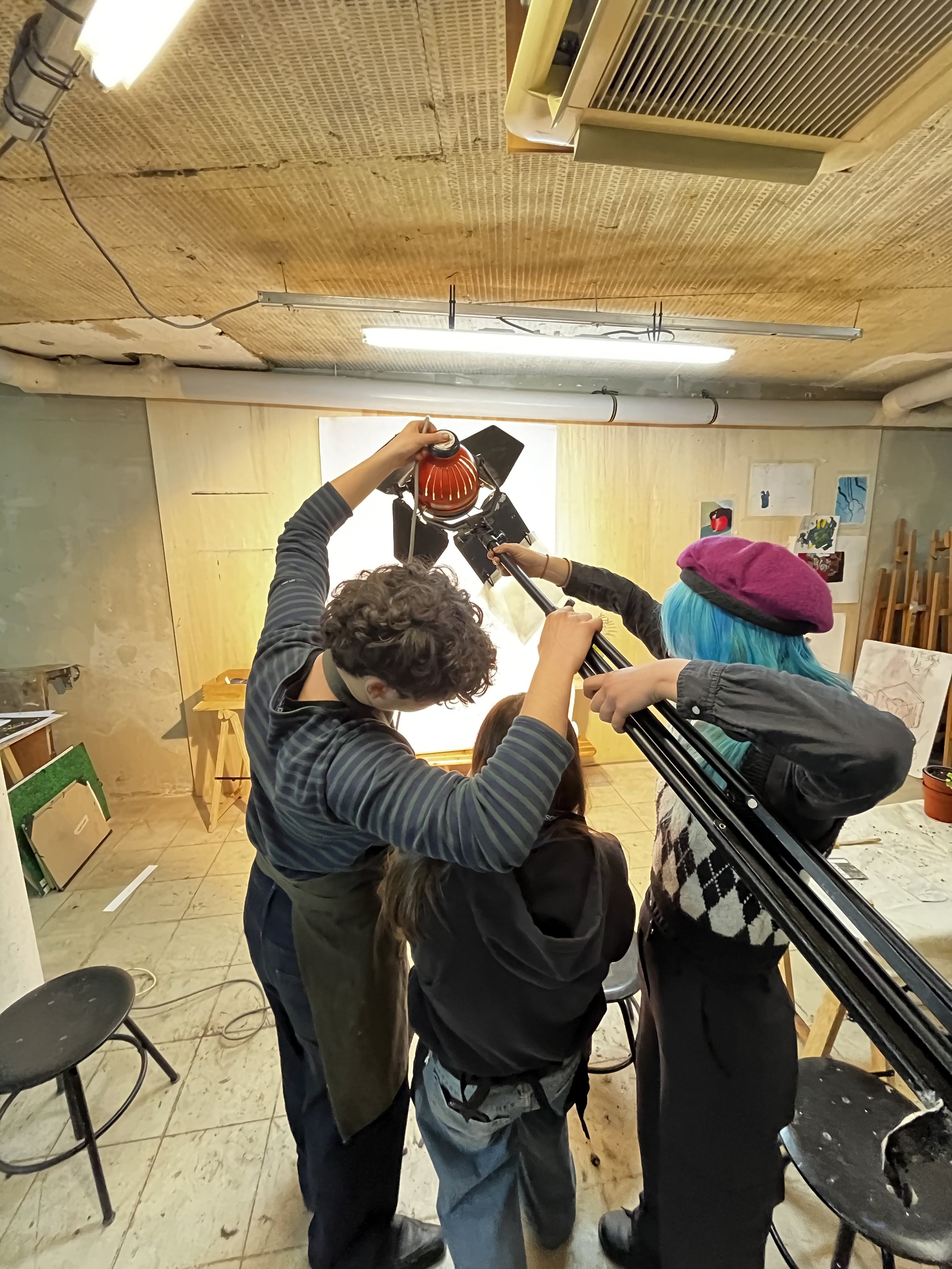 - atelier DESSIN avec tables à dessin pivotantes 50x70 cm, graphites & mie de pain, palettes, pinceaux.